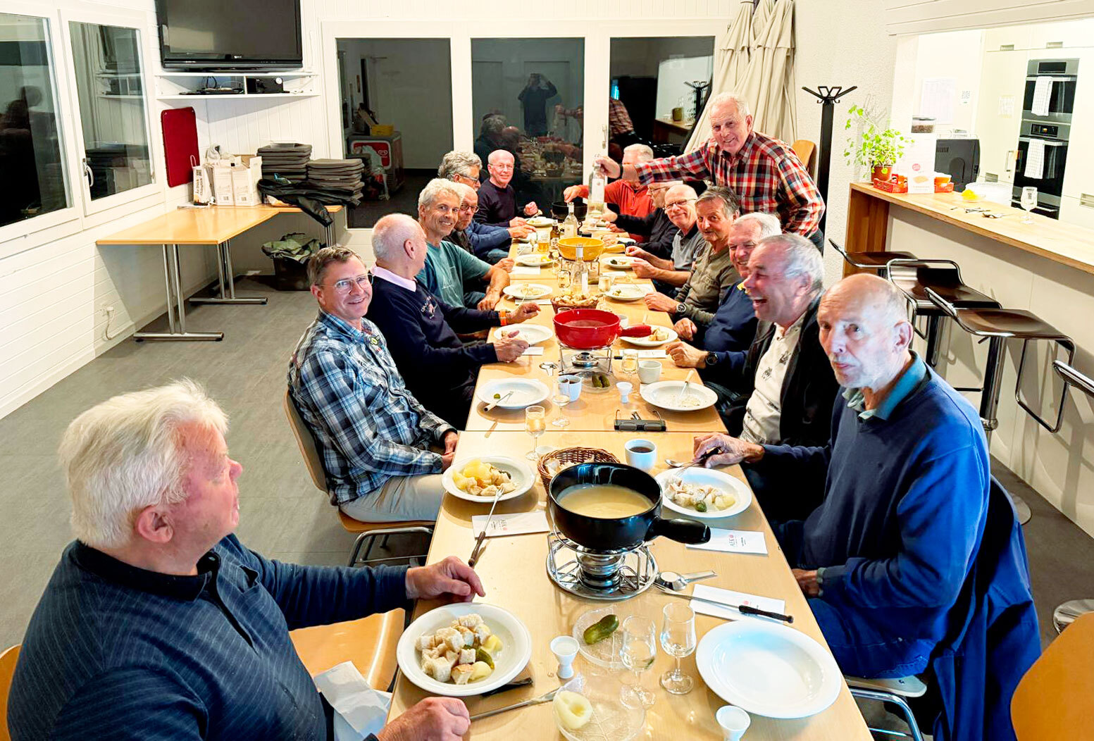Umso mehr genossen wir das gemeinsame Fondue-Essen – wie immer meisterhaft von Armin zubereitet und charmant von Martin serviert. Kaum war der letzte Käsefaden gezwirbelt, lockte ein feines Dessert – und natürlich durfte der obligatorische Kirsch nicht fehlen.