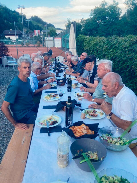 Einige Senioren konnten altersbedingt nicht mehr spielen, kamen aber gerne zum Nachtessen. Nach einem feinen Apéro eröffnete Obmann Fernando das Salatbuffet. Dazu gab es eine Bratwurst vom Grill, so gebrätelt, wie es jeder gerne hatte – einfach spitzenmässig. Mit einem süffigen Chianti wurde fröhlich angestossen und mit Vieille Poire/Prune und Calvados den schönen Sommerabend abgeschlossen.