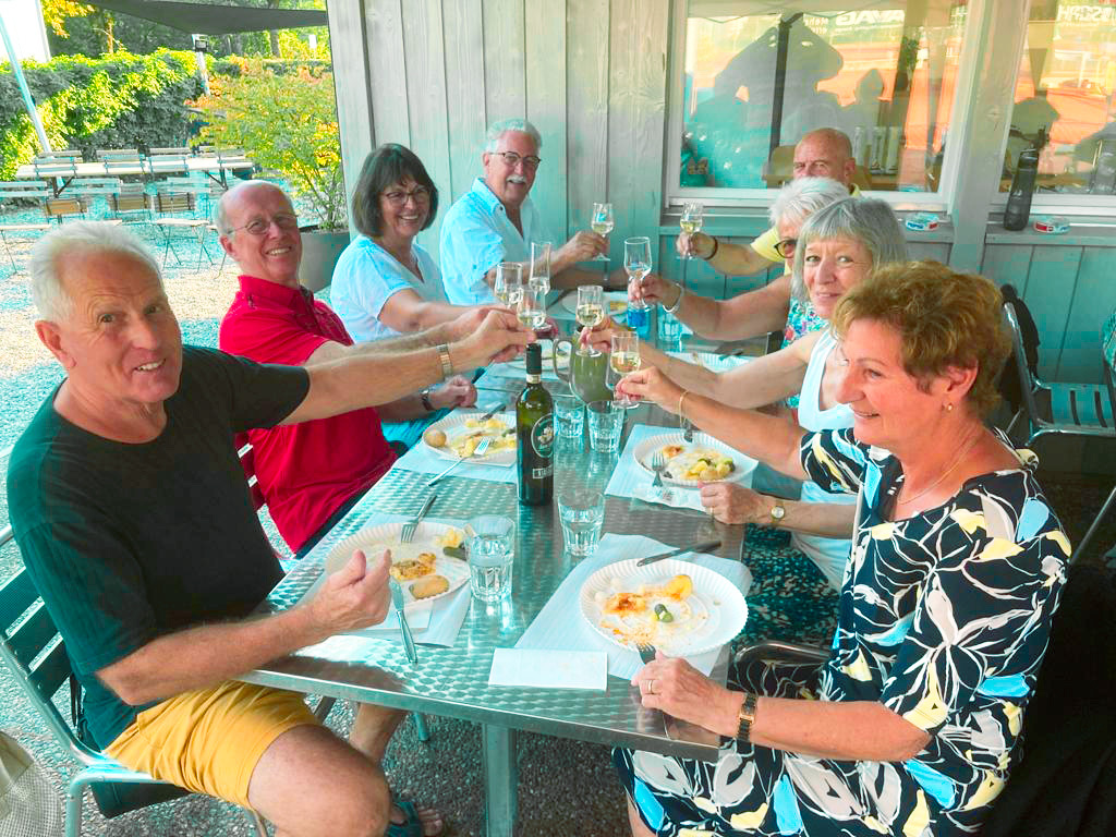 Zum Apéro ab 17.30 Uhr waren auch die PartnerInnen, welche nicht Tennis spielen, eingeladen. Ob es das Wetter war oder einfach der «Gluscht» nach einem Raclette, so viele wie diesmal kamen schon lange nicht mehr zum Raclette-Abend. Mit einem erfrischenden Spumante begrüsste Obmann Fernando die eintrudelnden Seniorinnen und Senioren und das grosse Plaudern begann.
