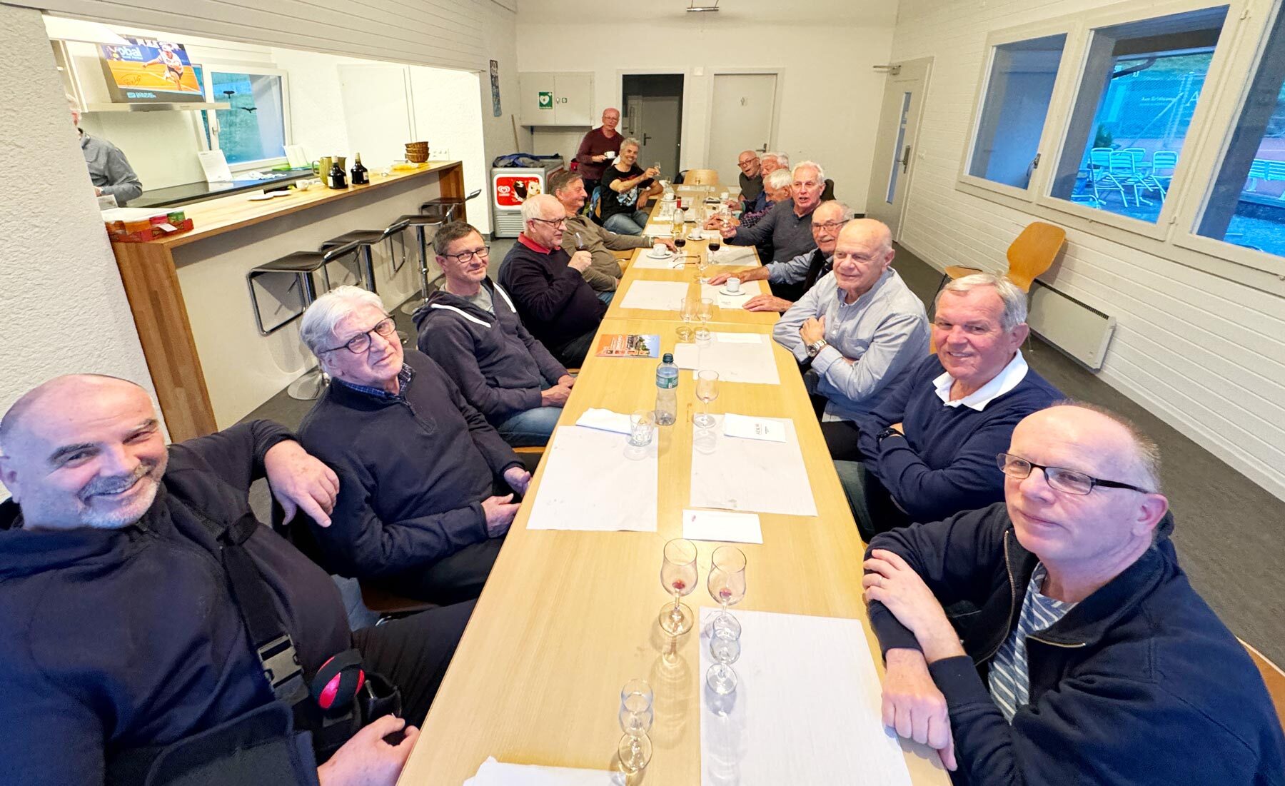 In der warmen Tennisstube bereitete derweil das Koch-Team unter der Leitung eines Belgiers das Essen vor. Die restliche Gruppe erfreute sich am Apéro und liess die gute alte Zeit aufleben. Die Penne an einer würzigen Gorgonzolasauce waren köstlich und auch der Grappa durfte zum Abschluss nicht fehlen.