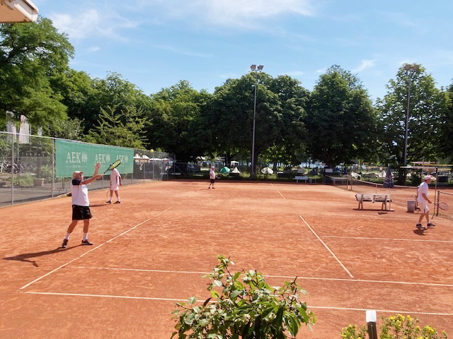 Von 9 Uhr bis ca. 11.20 Uhr wurde in unterschiedlichen Paarungen gespielt. Im Vordergrund stand der Spass am Tennis spielen, dennoch wurde hier und dort verbissen gekämpft. Nach 2 Stunden unter der heissen Sonne von Thun ging auch dem Schreibenden der Schnauf aus und es gelangen ihm nur noch vereinzelt Asse.